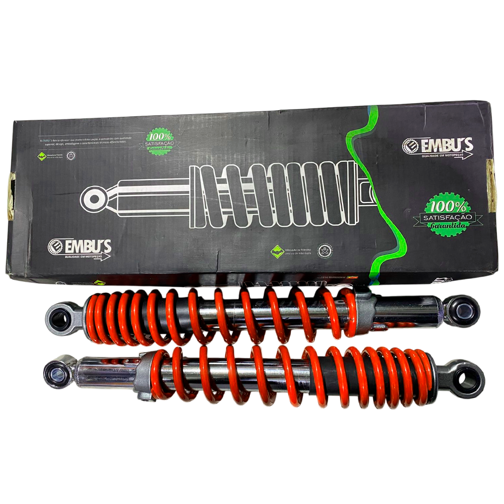 Trata‑se de um par (lado esquerdo + lado direito) de amortecedores traseiros da marca EmBus, desenvolvidos para aplicação no modelo Yamaha Fazer150 nos anos 2014 2018. O produto aparece anunciado como “mod original / mola vermelha”, o que sugere correção diferenciado e compatibilidade com os encaixes da peça original da moto.